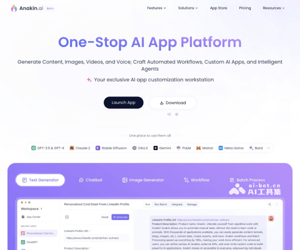 Anakin.ai 是一个一站式无代码 AI 应用构建平台,用户只需一分钟即可快速创建一个属于自己的 AI 应用,包括内容创作、文案、问答、图像生成、视频生成、语音生成、智能 Agent、自动化工作流、自定义 AI 应用等,帮助即使没有编程或技术背景的用户也能够利用AI技术来增强工作效率和创造力。